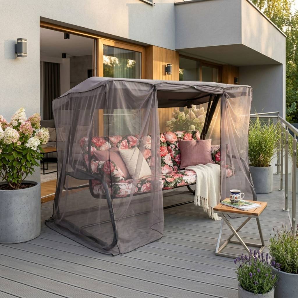La balancelle de jardin Celebes est une solution fonctionnelle pour créer une zone de détente confortable dans le jardin, sur la terrasse ou près de la maison. Équipée de coussins, d'un toit et d'une moustiquaire, elle permet de se reposer confortablement en plein air à tout moment de la journée. C'est un choix pratique pour les personnes qui apprécient le confort et un espace de loisirs bien organisé.
