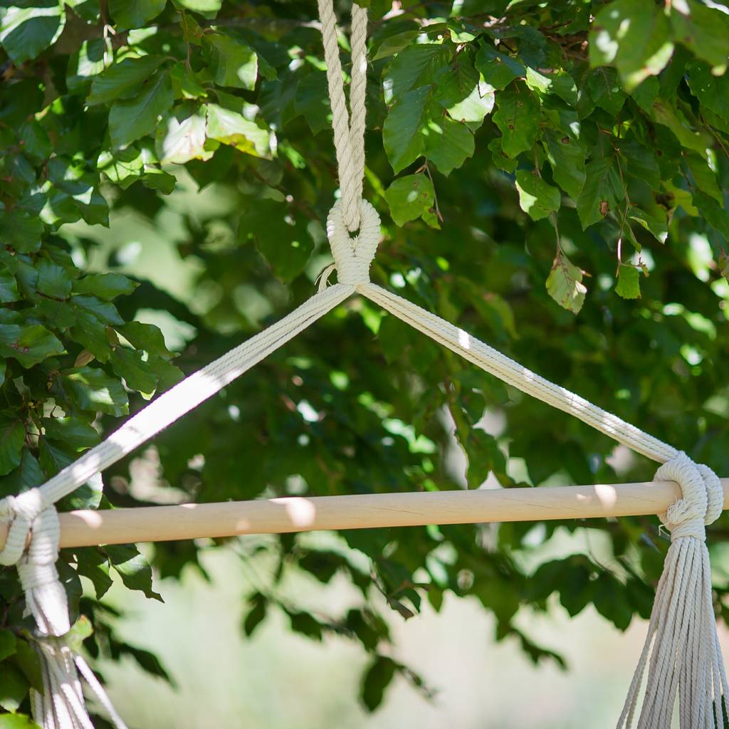 L'assise en polycoton allie confort d'utilisation et durabilité, ce qui la rend idéale aussi bien pour l'intérieur que pour l'extérieur. Le matériau est agréable au toucher et résistant à l'usage quotidien. La structure basée sur un système de cordes permet une suspension rapide et sans problème, sans nécessiter de montage complexe. Sa forme compacte permet d'adapter facilement la chaise à différents espaces, ainsi que de la ranger commodément hors saison.