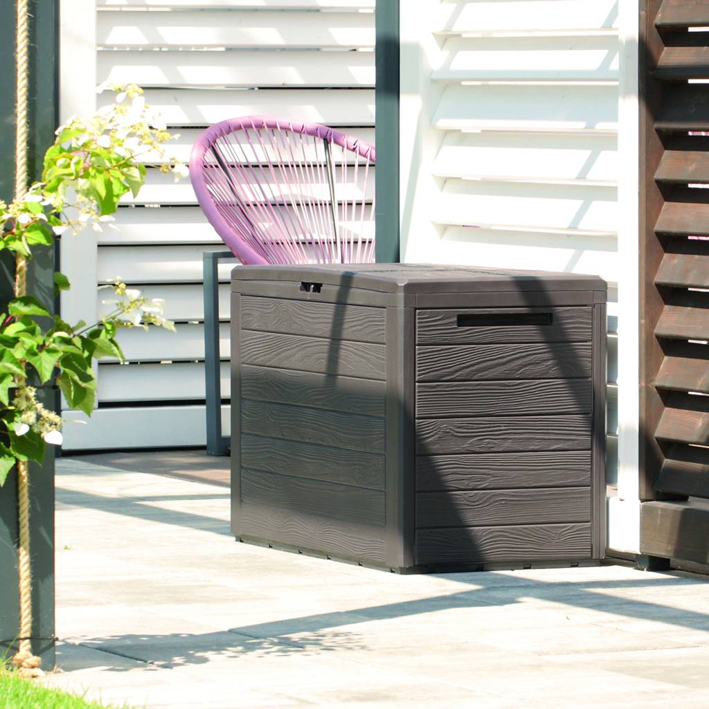 Le coffre anthracite Woodebox n'est pas seulement une solution pratique pour le rangement, mais aussi un élément décoratif attrayant pour votre balcon, terrasse ou jardin. Les couleurs neutres et la surface avec une texture rappelant le bois s'harmonisent avec l'environnement, créant un ensemble cohérent. Woodebox est extrêmement facile à monter et à démonter – tout cela sans l'utilisation d'aucun outil, ce qui permet un changement facile d'emplacement ou un stockage hors saison.