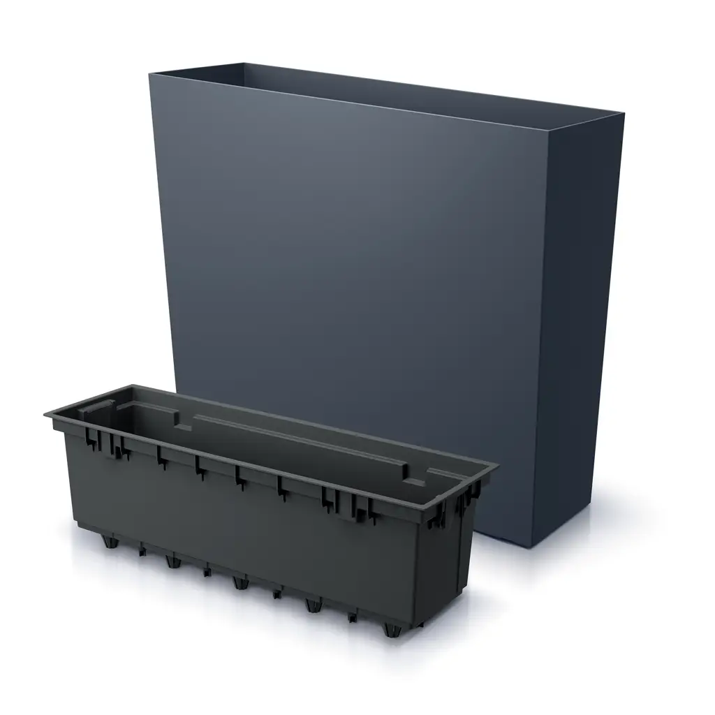 Fabriquée en plastique durable résistant à l'humidité, aux rayons UV et aux conditions atmosphériques variables, elle convient à une utilisation tout au long de la saison. L'insert interne limite la quantité de substrat nécessaire, facilite la plantation et l'entretien des plantes. Sa forme rectangulaire et allongée favorise la plantation d'herbes ornementales, d'arbustes ainsi que de compositions saisonnières plus importantes. C'est une proposition fonctionnelle aussi bien pour les espaces privés que commerciaux.