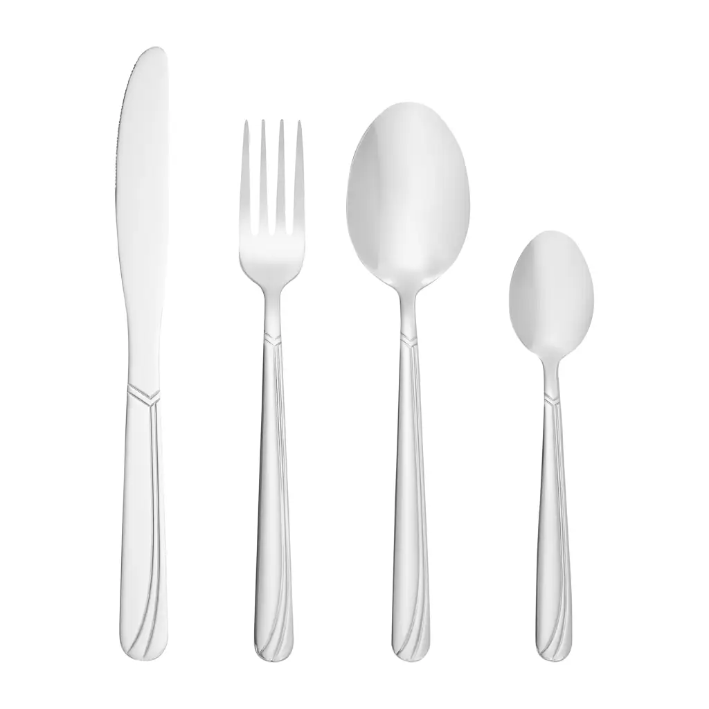 Cet ensemble de couverts de 24 pièces fabriqué en acier inoxydable est la combinaison idéale de simplicité et de fonctionnalité. Sa forme simple et classique, dotée d'un gaufrage délicat sur le manche, ajoute du charme à tout service de table. Grâce à leur design universel, ces couverts se marient parfaitement avec la vaisselle ronde traditionnelle ainsi qu'avec la vaisselle carrée moderne.