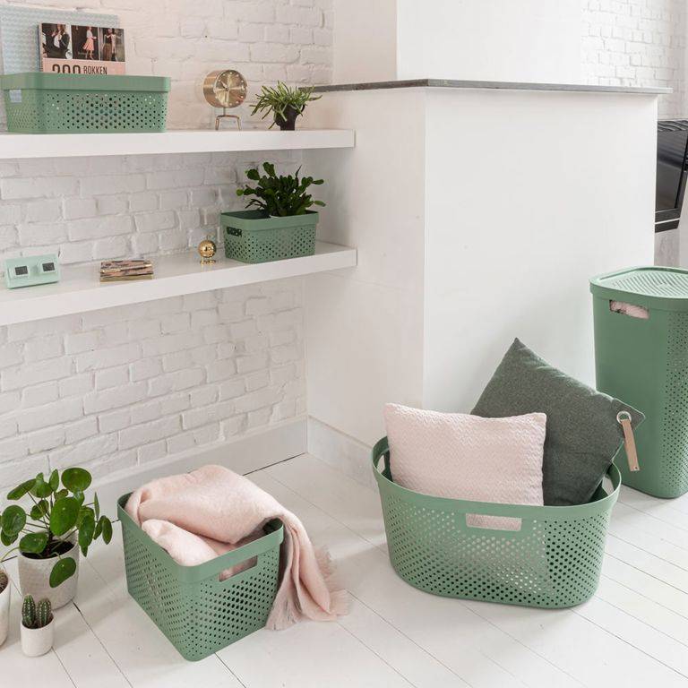 La collection Infinity Recycled mise sur une approche responsable de la production, en utilisant du plastique provenant à 100 % du recyclage. Ce matériau se caractérise par une grande durabilité et une structure lisse, ce qui permet un nettoyage rapide et efficace. Le motif ajouré assure une circulation constante de l'air, ce qui est particulièrement important lors du stockage de textiles, tels que des serviettes ou des vêtements. Grâce à des dimensions conçues avec précision, les bacs peuvent être empilés de manière stable les uns sur les autres, optimisant ainsi l'utilisation de l'espace disponible dans les armoires ou sur les étagères.